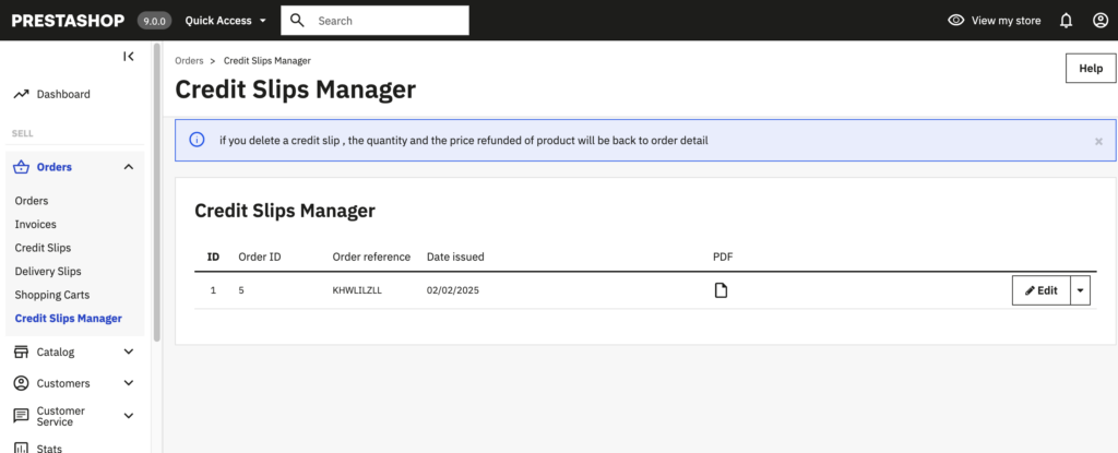 after the generation of credit slips, several merchants seek to correct, modify or delete them. Currently no solution to do so, for this we created our Credit slips Manager module, which allows you to edit the credit numbers, the date and delete it to correct them.